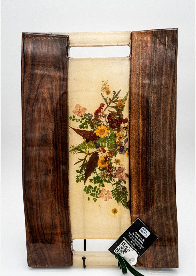 Heavy Acrylic Resin layered real dried flowers with thick Black Walnut wood front side High gloss display side. Back is matt white and oiled wood for cutting